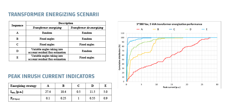 An experimental study has been performed to compare and identify the best energizing conditions for a power transformer (see tables and figure). Statistically, it appears that the most suitable strategy to energize a power transformer is to control the previous opening conditions, given that this is possible. If it is not possible (as in the case of a protection operation where the opening timing cannot be controlled), the best solution is to compute and use the residual flux level. Hence the two most probable scenarios: “controlled opening-controlled closing,” and “random opening-controlled closing with residual flux.”